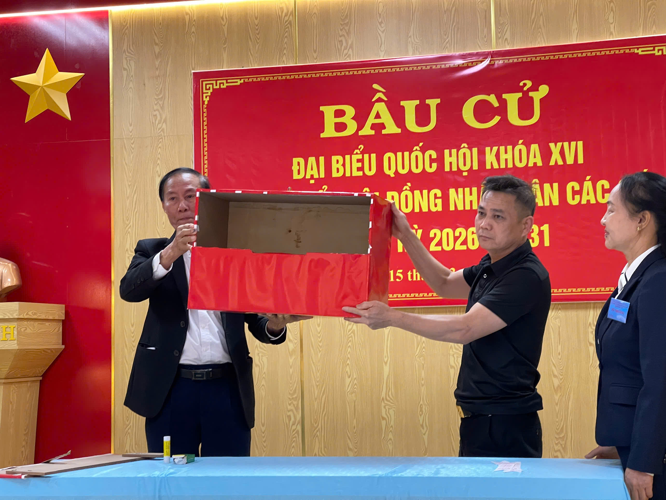 Công tác kiểm tra, dán niêm phong thùng phiếu công khai trước toàn thể cử tri tại khu vực bỏ phiếu.