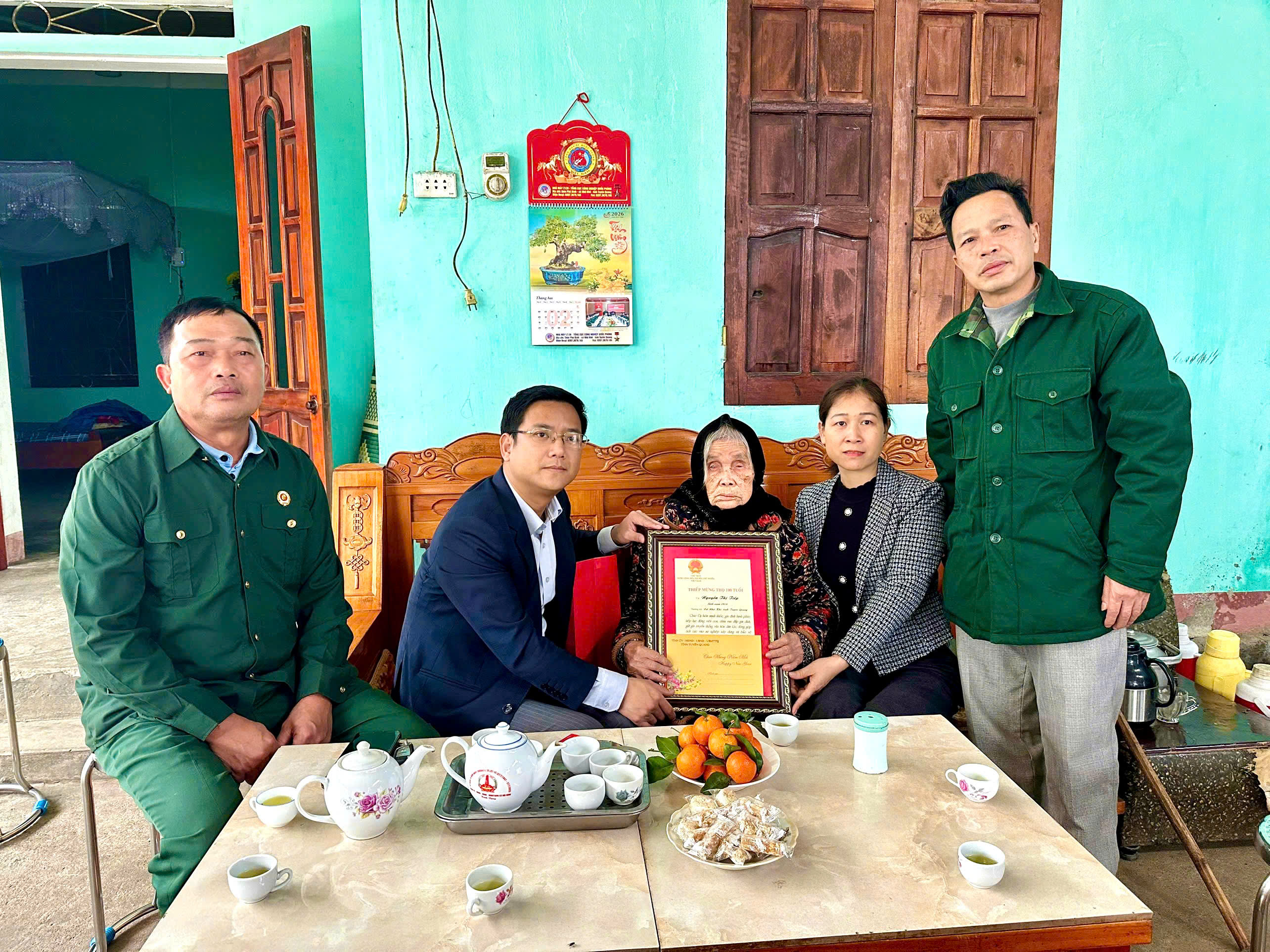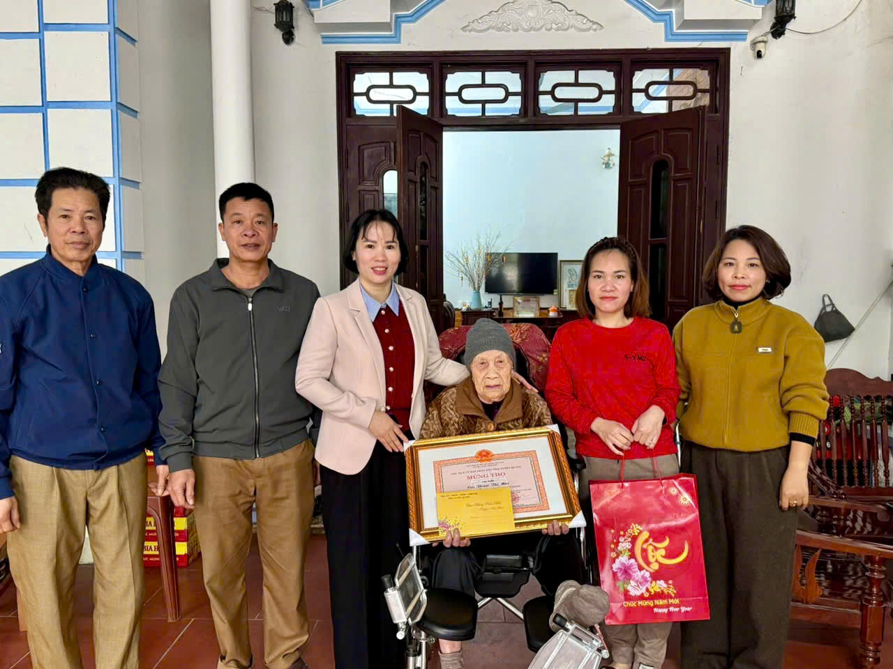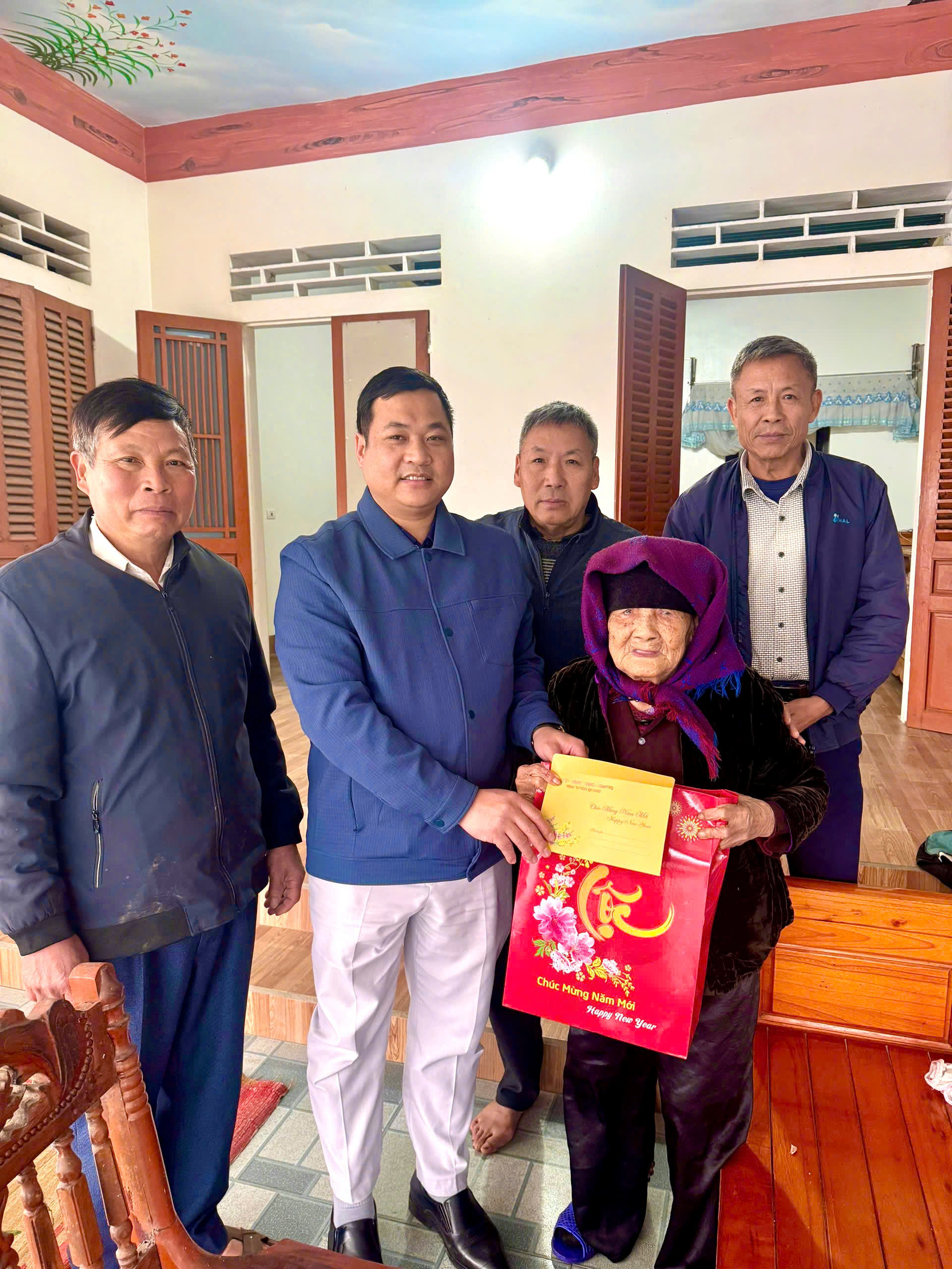 Nhân dịp đến thăm, trao quà cho các cụ tròn 100 tuổi, các đồng chí lãnh đạo đã ân cần thăm hỏi, gửi lời chúc tốt đẹp, mong các cụ luôn dồi dào sức khỏe, sống vui, sống thọ, tiếp tục là điểm tựa tinh thần vững chắc để con cháu yên tâm lao động, sản xuất, xây dựng gia đình no ấm, hạnh phúc.