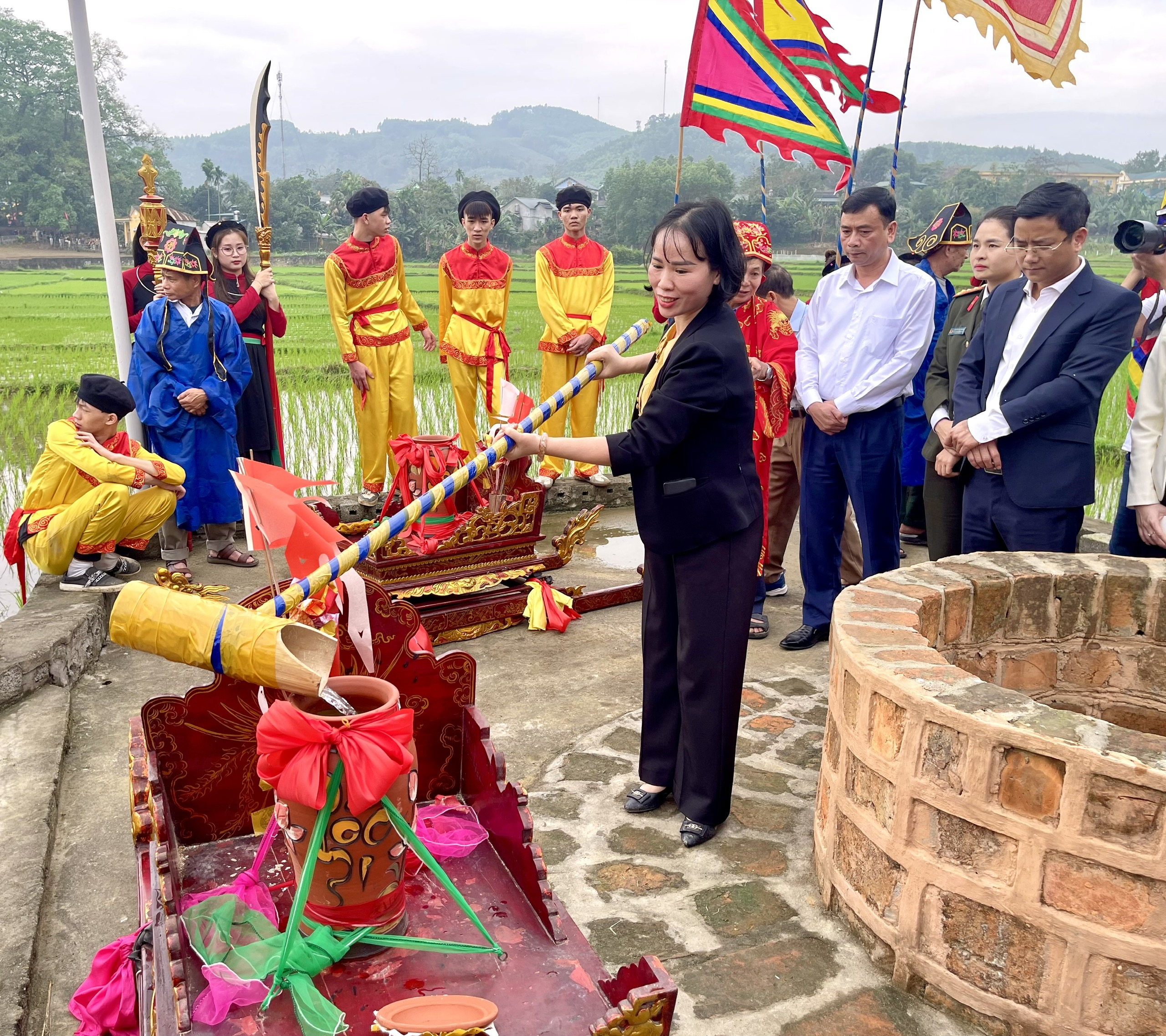 Các đồng chí lãnh đạo UBND xã rót nước từ Giếng làng về Đình