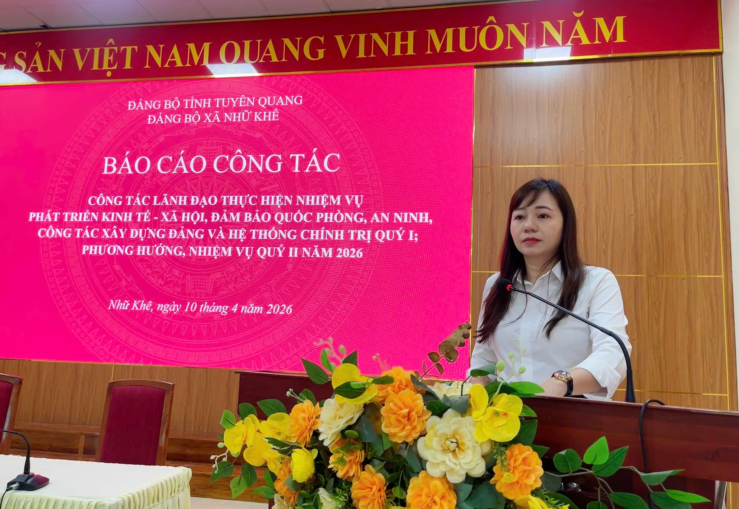Đồng chí Ngô Thị Thu Thủy, Phó Bí thư thường trực Đảng uỷ xã đọc báo cáo kết quả lãnh đạo thực hiện nhiệm vụ phát triển kinh tế - xã hội, quốc phòng - an ninh; công tác xây dựng Đảng quý I và phương hướng, nhiệm vụ quý II năm 2026